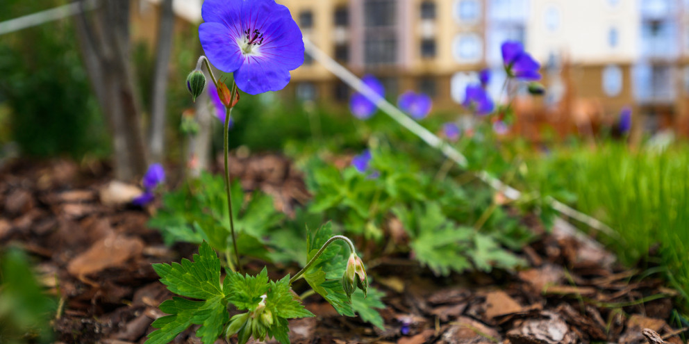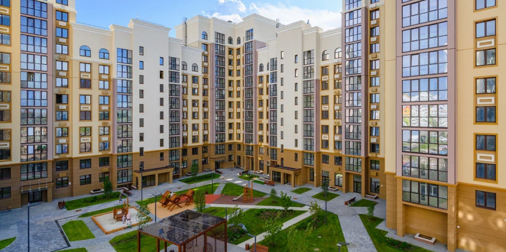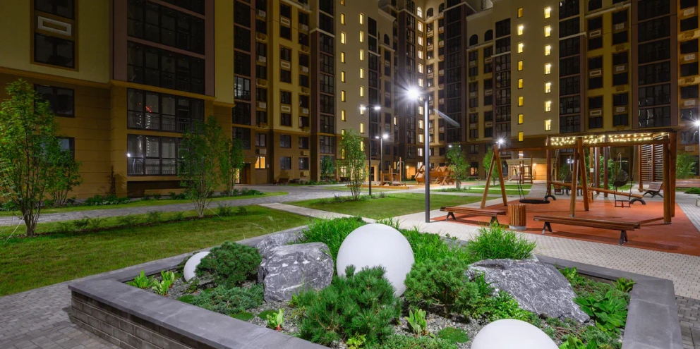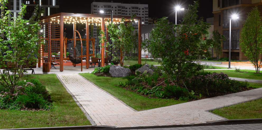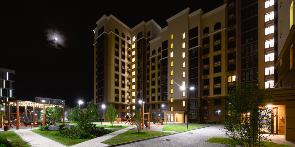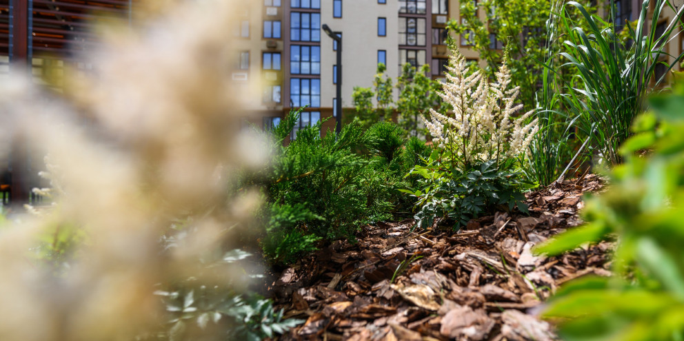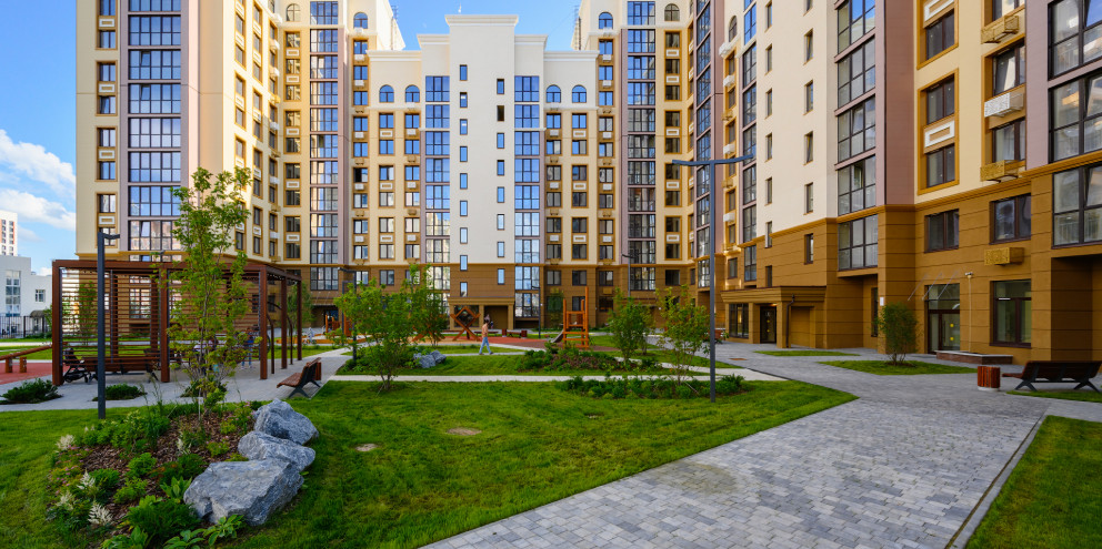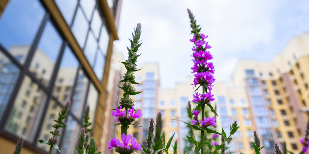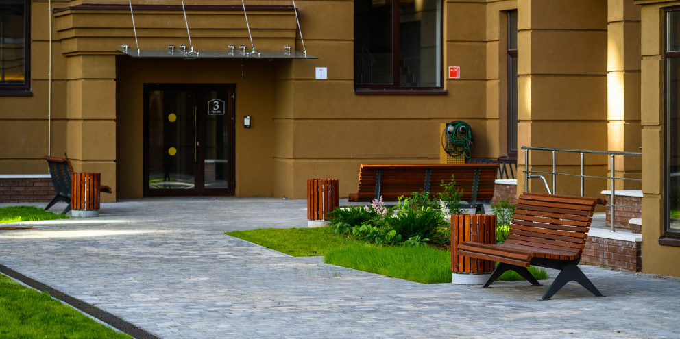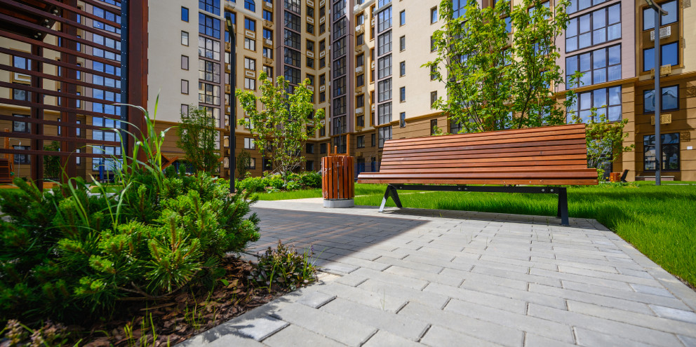 Во дворе дома будет высажено множество растений, создающих уютный ландшафт. Доступ во двор будет только у жителей парк-квартала.Закрытый двор -