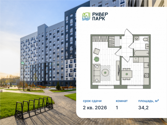 1-комнатная, 34.2 м²