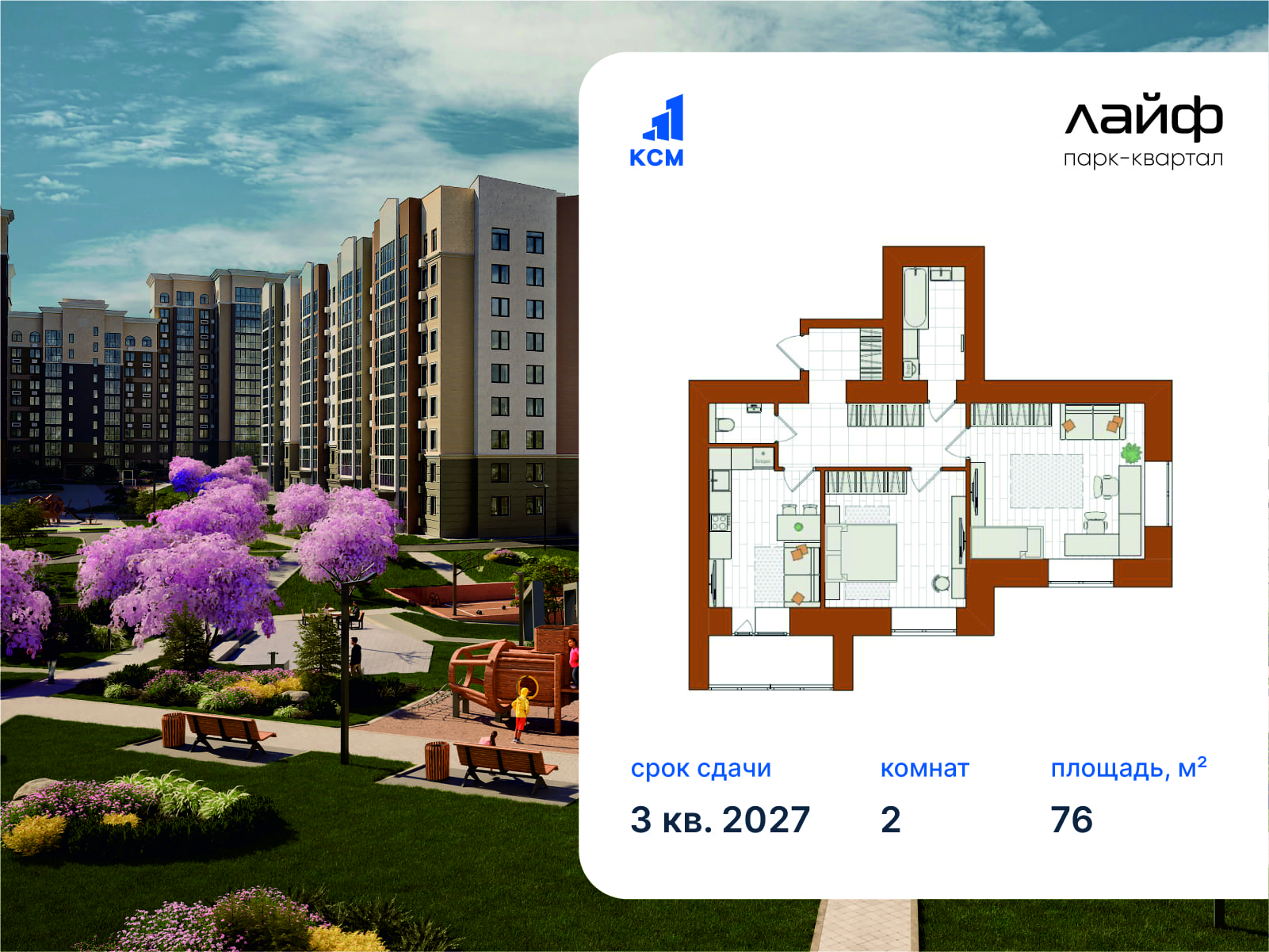 2-комнатная, 76 м²
