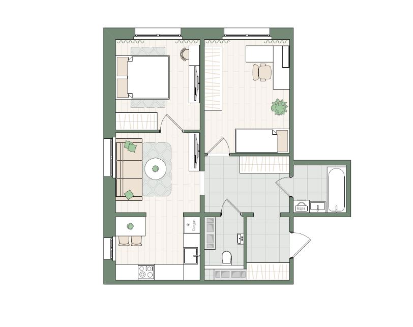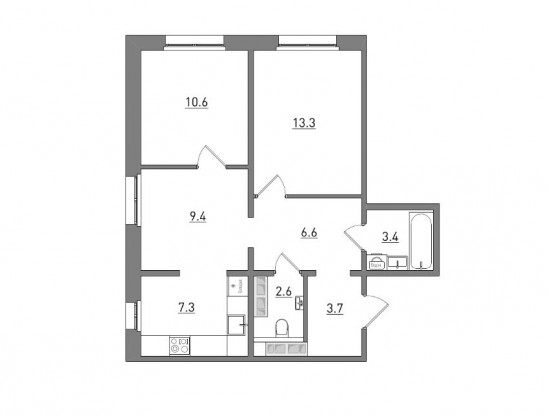 Евро 3-комнатная, 56.9 м²