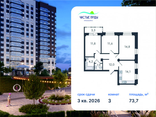 3-комнатная, 73.7 м²