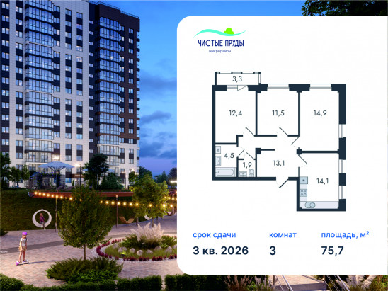 3-комнатная, 75.7 м²