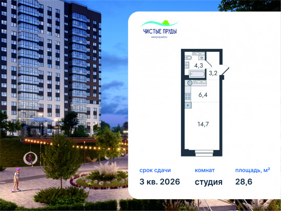 Студия, 28.6 м²