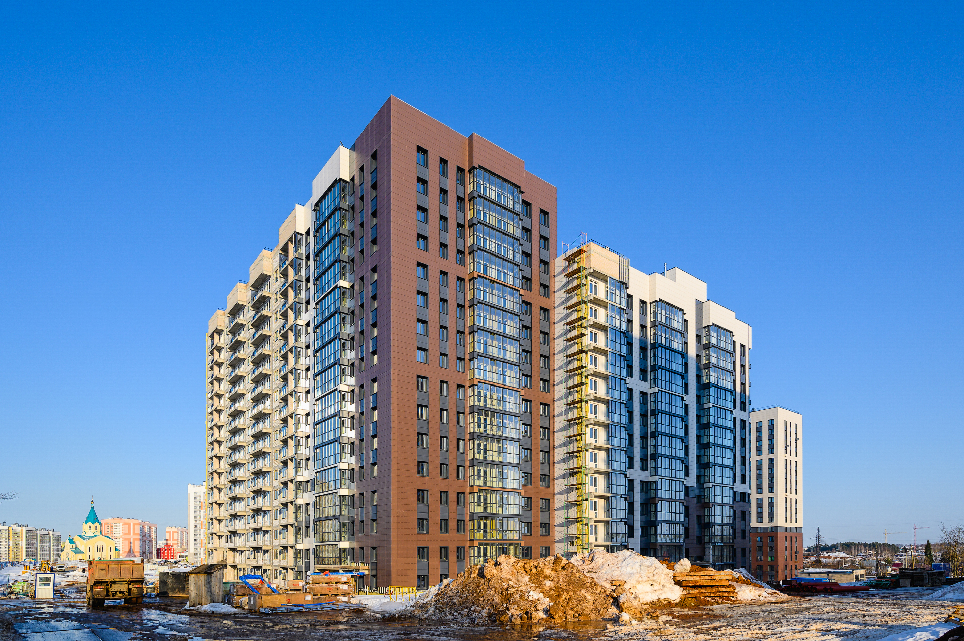 Процветающий микрорайонВнутри микрорайона есть абсолютно всё, что необходимо для комфортной жизни: добрые соседи, две школы, пять детских садов, своя котельная, поликлиника, храм, магазины и торговые центры, фитнес-клубы, скверы, площадки для спорта и прогулок.